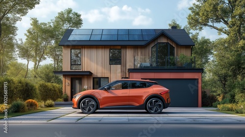 Fototapeta premium A beautiful villa with an electric car parked at the entrance and solar...