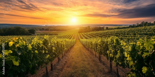 Fototapeta premium A beautiful vineyard at sunset, with lush rows of grapevines leading to the horizon.