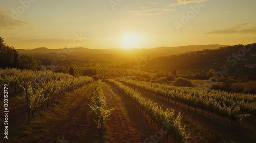 Fototapeta premium A beautiful vineyard landscape at golden hour during a sunset
