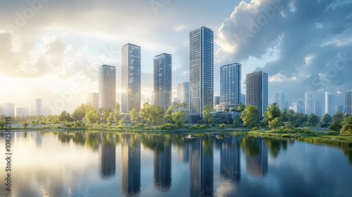 Naklejka premium A Beautiful Vision of a Futuristic Green City, Blending Sleek Skyscrapers with Vibrant Natural Greenery and a Tranquil Lake, Showcasing Eco-Friendly Urban Design and Sustainability