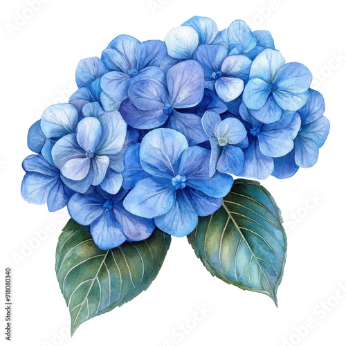 Fototapeta premium A beautiful watercolor illustration of a blue hydrangea bouquet with lush green leaves, showcasing delicate petals in various shades of blue