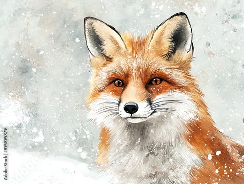© Tondone, Obraz premium A beautiful watercolor illustration of a red fox in a snowy winter setting with a soft background.