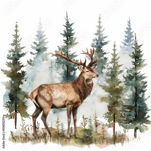 Fototapeta premium A beautiful watercolor of a wild deer in the forest, isolated minimal with white background