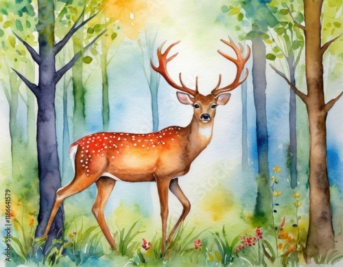 Fototapeta premium A beautiful watercolor painting of a spotted deer standing gracefully among vibrant trees in a serene forest.