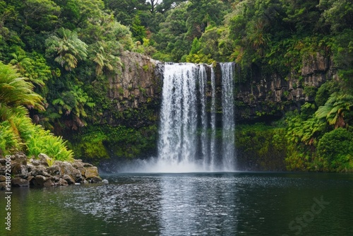 © Alokya, Obraz premium A beautiful waterfall cascades into a serene and reflective lake
