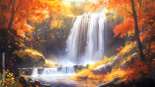 © Thiago, Obraz premium A beautiful waterfall cascades through a forest with vibrant autumn colors. Waterfall Cascade. Illustration