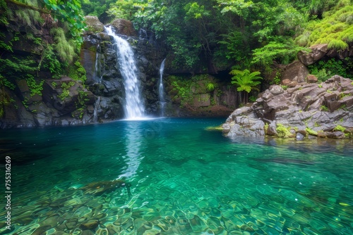 Naklejka premium A beautiful waterfall cascading into a crystal clear pool. Surrounded by lush...