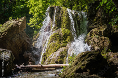 Naklejka premium A beautiful waterfall deep in the forest, steep mountain adventure in the...