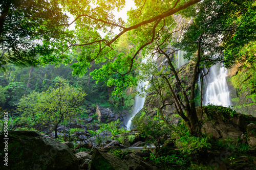 © Stock_ko, Obraz premium A beautiful waterfall deep in the tropical forest, steep mountain adventure in the rainforest.
