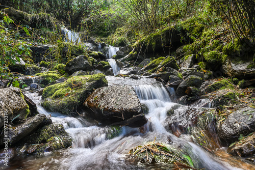 © niladri, Obraz premium A beautiful waterfall flowing through lush green Annapurna Conservation Area, Nepal