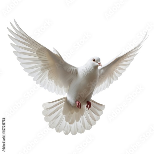 © Nice PNG, Obraz premium A beautiful white dove with wings spread wide in flight isolated on white background
