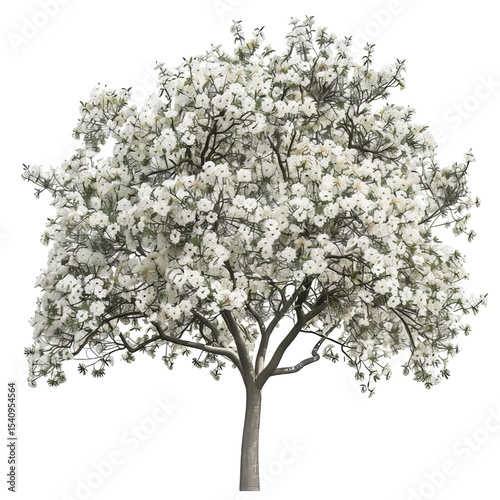 Obraz premium A beautiful white flowering tree in full bloom, showcasing delicate blossoms and a lush canopy.