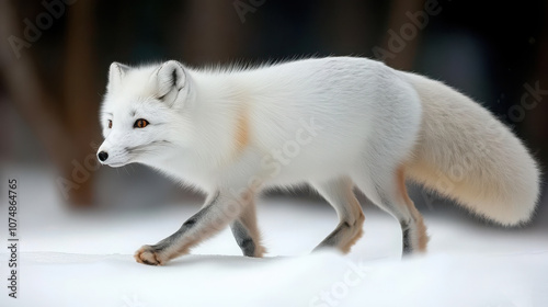 Fototapeta premium A beautiful white fox walking gracefully through a snowy landscape,...