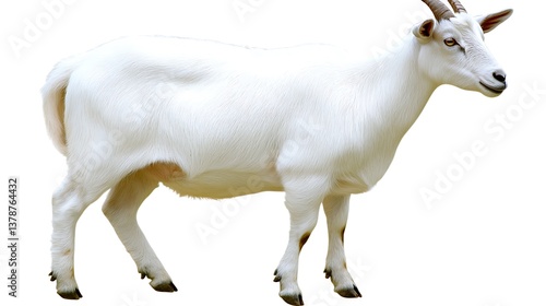 © Muldiawan, Obraz premium A beautiful white goat stands isolated on a plain background