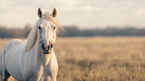 © watcharee, Obraz premium A beautiful white horse stands gracefully in a golden field, showcasing its elegance against a serene, soft-focus background.