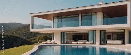 Fototapeta premium A beautiful white house with a refreshing pool in front
