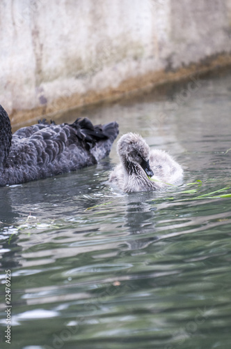 Obraz premium A beautiful white Swan with her offspring swim in the pond.