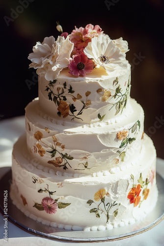 Fototapeta premium A beautiful white wedding cake decorated with colorful flowers