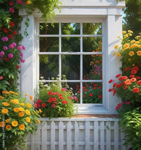 Fototapeta premium A beautiful white window perched atop a wooden fence overlooking a vibrant green garden filled with colorful flowers and lush foliage, natural stone, leafy greens