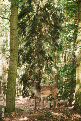 Fototapeta premium A beautiful wild deer with horns in the autumn forest among the trees.