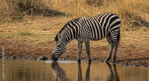 © photohappy, Obraz premium A beautiful wild zebra stands drinking cool water from a gently flowing river, showing off its classic black and white stripes in the warm savanna light ,ungulate, resting, environment
