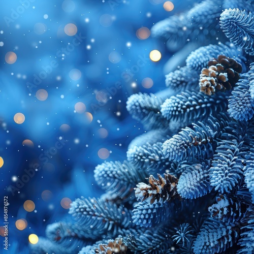 © easybanana, Fototapeta premium A beautiful winter scene of a snow-covered fir tree with twinkling lights in the background.
