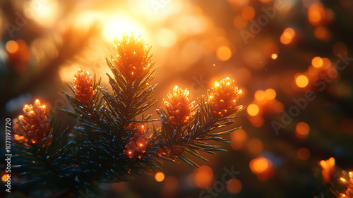 © van , Fototapeta premium A beautiful winter scene with blue and orange lights, snowflakes on the branches of an evergreen tree,