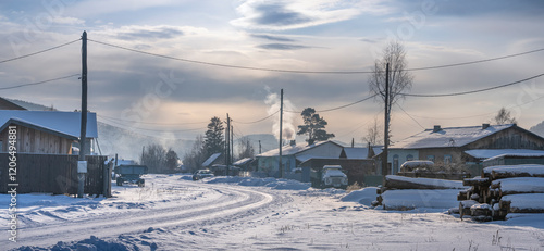 Obraz premium A beautiful Winter Village Scene showcasing a SnowCovered Street and lovely Homes nearby Classic view of Russia in Winter. Russian village in Siberia, Russia, Courtyard and buildings, Narva village