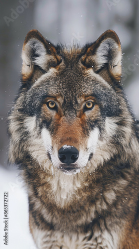 © alfa27, Obraz premium A beautiful, wolf with a brown and black coat stands in the snow