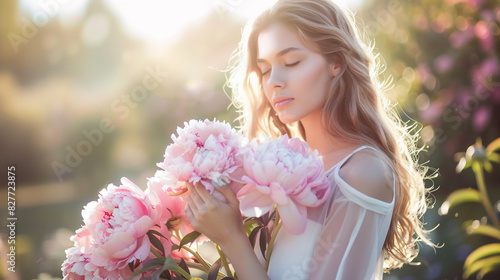 Fototapeta premium A beautiful woman in a pastel-hued outfit stands in a dreamy outdoor setting, her arms filled with romantic pink peonies that evoke a sense of joy and beauty