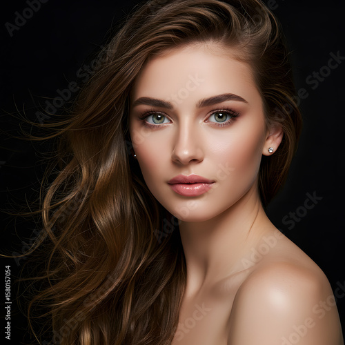 © ratna, Fototapeta premium A beautiful woman poses with curly brown hair and makeup in a studio