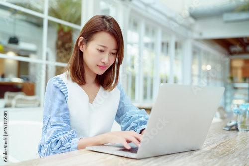 © Ekkasit A Siam, Fototapeta premium A beautiful woman wearing an Asian white shirt is sitting in front of a laptop computer shopping online with a happy smile in a bakery shop.