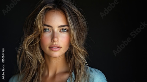 Fototapeta premium A beautiful woman with confident expression and casual clothes, showcasing fashion, hair, and cosmetics in a studio portrait