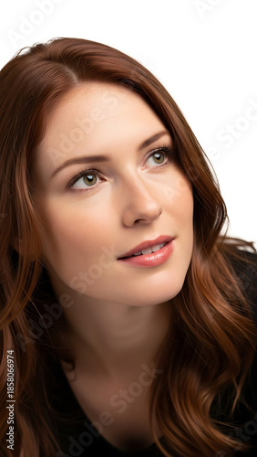 © LM, Fototapeta premium A beautiful woman with long brown hair and a subtle smile looks directly at the camera