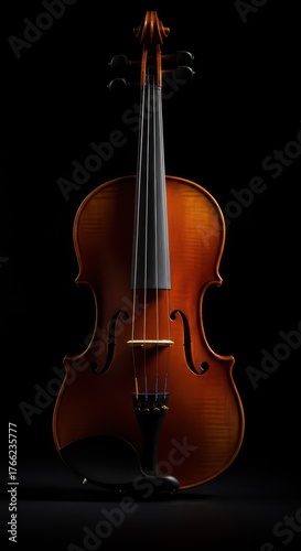 © Katherina, Fototapeta premium A beautiful wooden violin rests gracefully on a black background, highlighting its polished surface and classic curves in dramatic light ,artistic ,polished ,musical