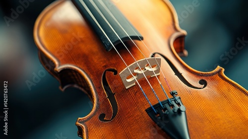 Fototapeta premium A beautiful wooden violin with its bow resting on top, the delicate curves and f-holes visible, soft, diffused light.