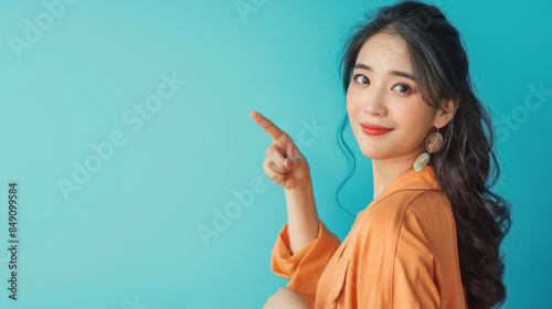 © Maksym, Fototapeta premium A beautiful young Asian woman elegantly pointing to a copy space light blue background, capturing her confidence and grace.