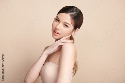 © kitthanes , Obraz premium A beautiful young Asian woman with clean, fresh skin against a beige background. Skincare, facial treatment, cosmetology, beauty, and spa. An elegant portrait of an Asian woman.