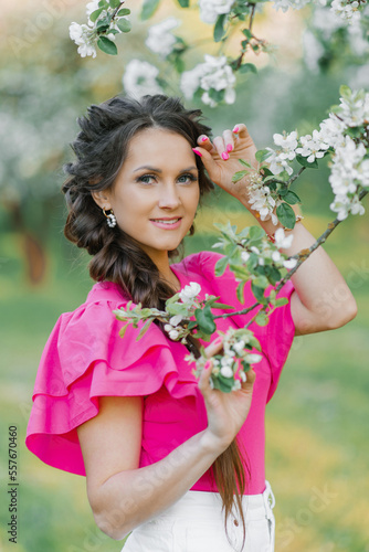 Fototapeta premium A beautiful young European woman with beautiful makeup and braids in spring in the park, in a blooming apple orchard