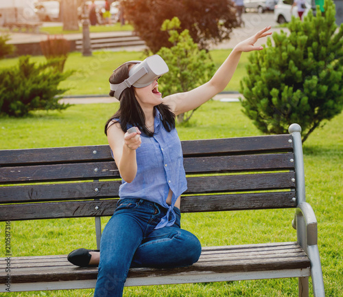 © romaset, Naklejka premium A beautiful young girl plays a game wearing virtual reality glasses on the street.
