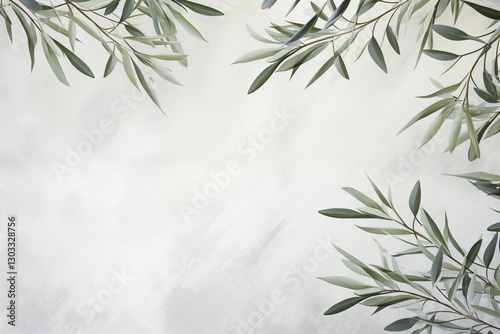 Fototapeta premium A beautifully arranged border of olive leaves and branches, framing a clean, neutral background with ample copy space for text.