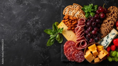 Fototapeta premium A beautifully arranged charcuterie board with fresh fruits, nuts, cheese, and whole grain crackers, with copy space, high-resolution photo, realistic photo, hyper realistic