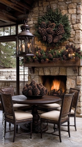 Obraz premium A beautifully arranged dining room table showcases lanterns and candles, complemented by pine cones and greenery garland, creating a warm winter ambiance by the fireplace