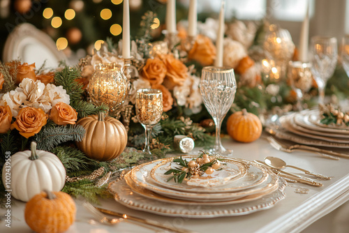 Naklejka premium A beautifully arranged dining table displays delicate floral arrangements, sparkling glassware, golden pumpkins, and candles, creating a cozy and inviting atmosphere for an autumn gathering