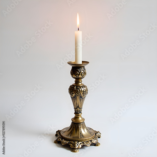 Naklejka premium A beautifully crafted antique candle holder with a flickering flame in a minimalist setting, photography of still life concept.