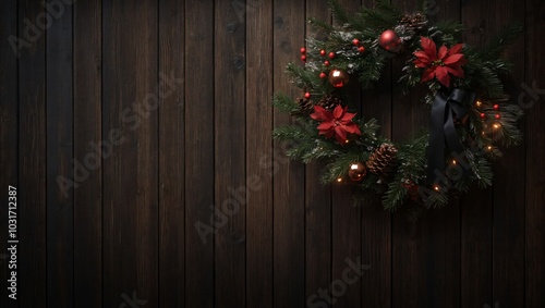 Fototapeta premium A beautifully crafted Christmas wreath adorned with red poinsettias, shiny ornaments, and warm lights, bringing festive joy against a rustic wooden background.