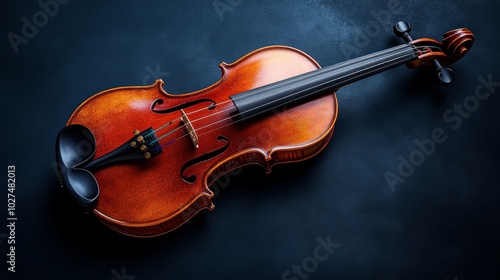© Joachim, Fototapeta premium A beautifully crafted classic violin rests on a dark textured surface, showcasing its rich wooden finish and fine craftsmanship, evoking elegance and timeless music.