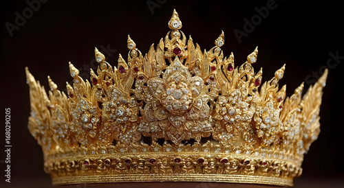 © sornram, Fototapeta premium A beautifully crafted golden crown adorned with intricate designs and jewels, symbolizing royalty and cultural heritage.