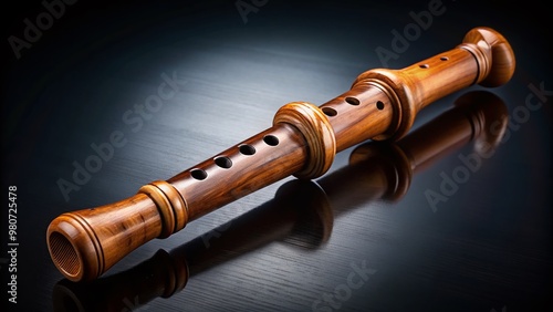 Naklejka premium A beautifully crafted, intricately detailed, wooden recorder instrument lies solo on a velvety dark background,