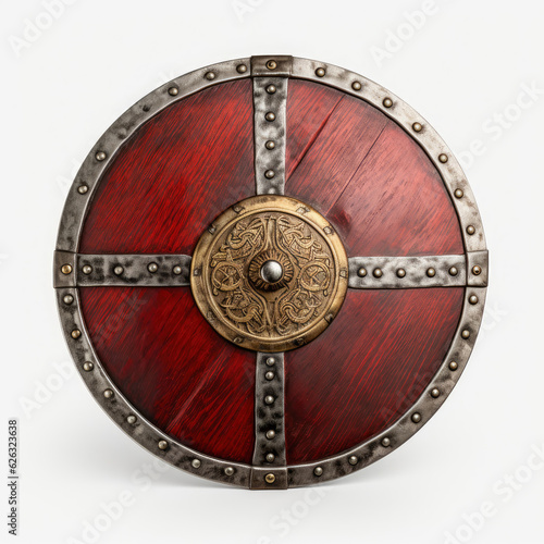 © LUPACO IMAGES, Naklejka premium A beautifully crafted shield with intricate decorative details in wood and metal